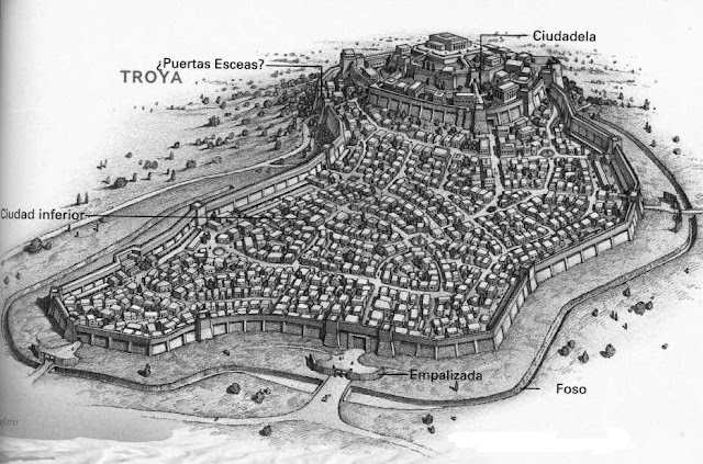 1. Calculamos la escala en la que está hecho el mapa, sabiendo que desde el triángulo morado que marca Troya a la cruz verde marcada en la playa hay 3 kilómetros en línea recta.